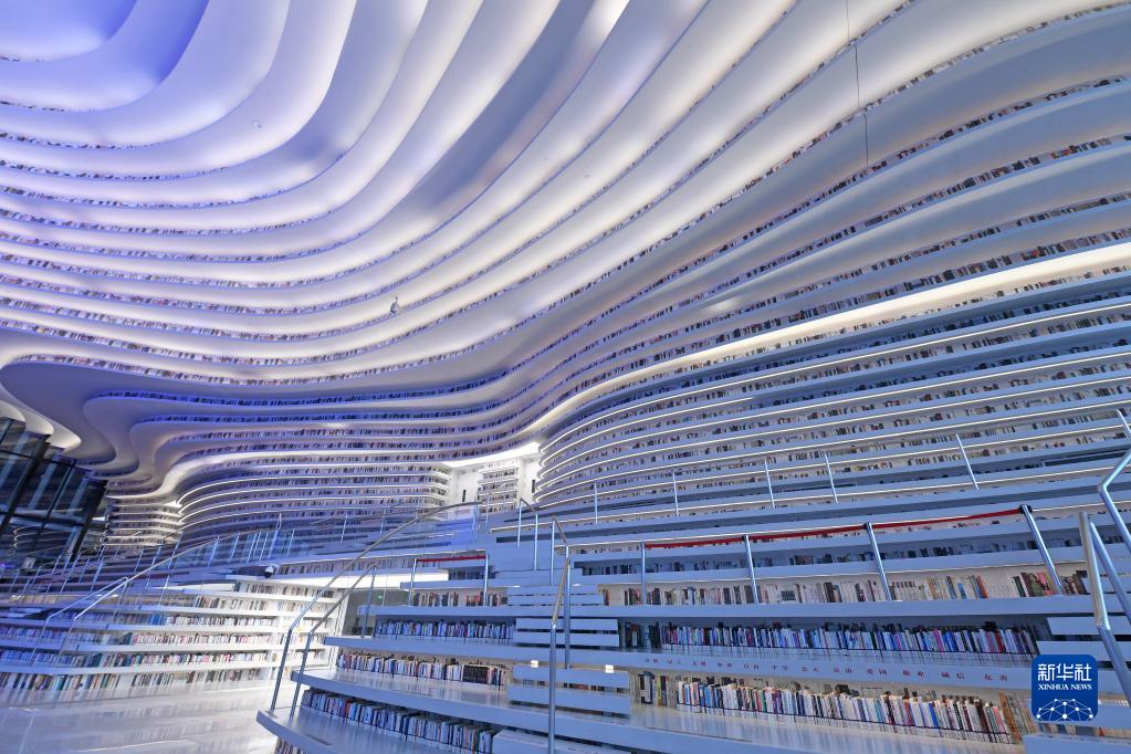 有着“滨海之眼”之称的滨海新区图书馆位于天津滨海文化中心,于2017年10月正式开馆,目前已成为天津滨海新区的文化“新地标”。“滨海之眼”的内里是图书馆中庭,中庭空间形象由“书山”和中间的球体构成。球体是“滨海之眼”的“眼球”,也是一个多功能厅,配置有环绕立体声和数字放映功能;“书山”则由34层阶梯平台构成。