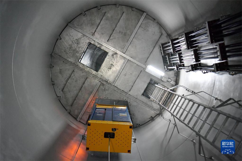 在位于天津市滨海新区的国家能源集团龙源电力汉沽风电场,刘彦波与胡众银搭乘提升机前往风机顶部定期检修(4月11日摄)。