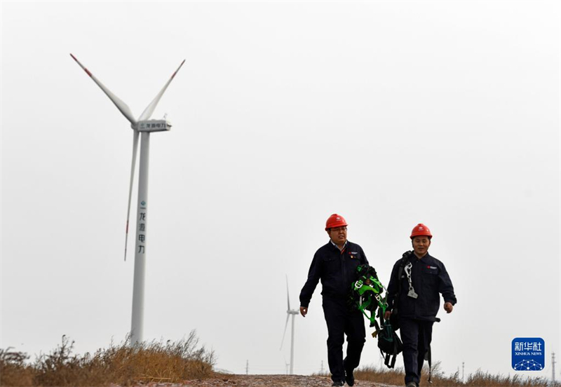 在位于天津市滨海新区的国家能源集团龙源电力马棚口风电场,刘彦波(左)和同事胡众银步行前往一风电机组进行检修作业(4月12日摄)。