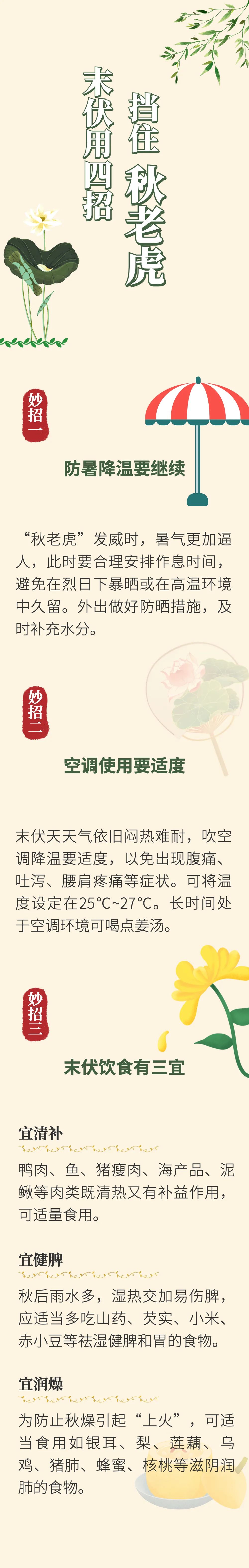 “初伏防中暑,中伏除病根,末伏躲老虎。”立秋后天气逐渐转凉,虽然早晚较凉,但中午仍然暑气逼人,这就是“秋老虎”在肆虐。此时,暑邪容易耗气伤津,人们养生注意这几点,可有效挡住“秋老虎”。