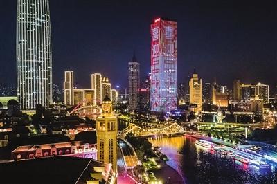 红旗飘扬灯光点缀 迎国庆天津节味浓