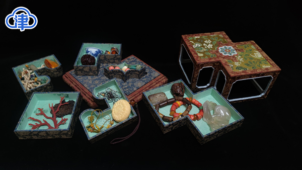 他拿出一个装有点翠蝶钗的囊匣,“我把蝴蝶图案的头钗设计成了插在山石木刻画中,一来减少对点翠的触摸,二来蝴蝶和山石交相呼应,设计的十分巧妙。”随后他又拿出了一个装有首饰的福寿齐眉多层方胜锦盒,“方胜,是以两个菱形压角相叠而构的几何图形或纹样,在我国古代的花瓶、窗格中经常能够见到。”高福浩说,他将方胜盒设计为三层,拼接后每一层的内部结构都有所不同,同时外表的锦布能够完全拼成一幅画,即融汇了我国传统文化中的几何美学,又增添了囊匣的趣味性。