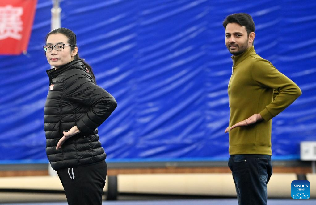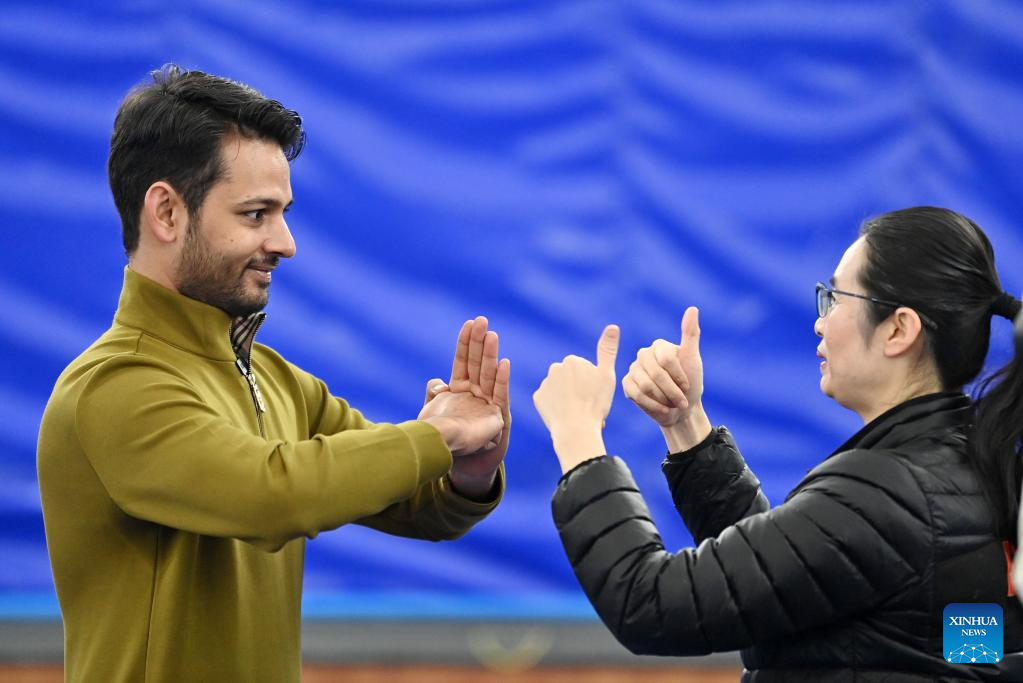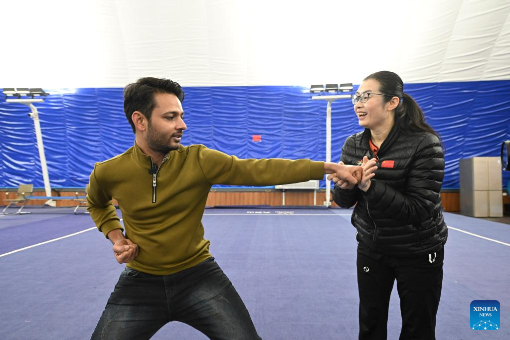 Muhammad Nabil (L) learns Huo-style boxing from Huo Jinghong at a martial arts gym in Xiqing District, north China's Tianjin, Dec. 25, 2022.