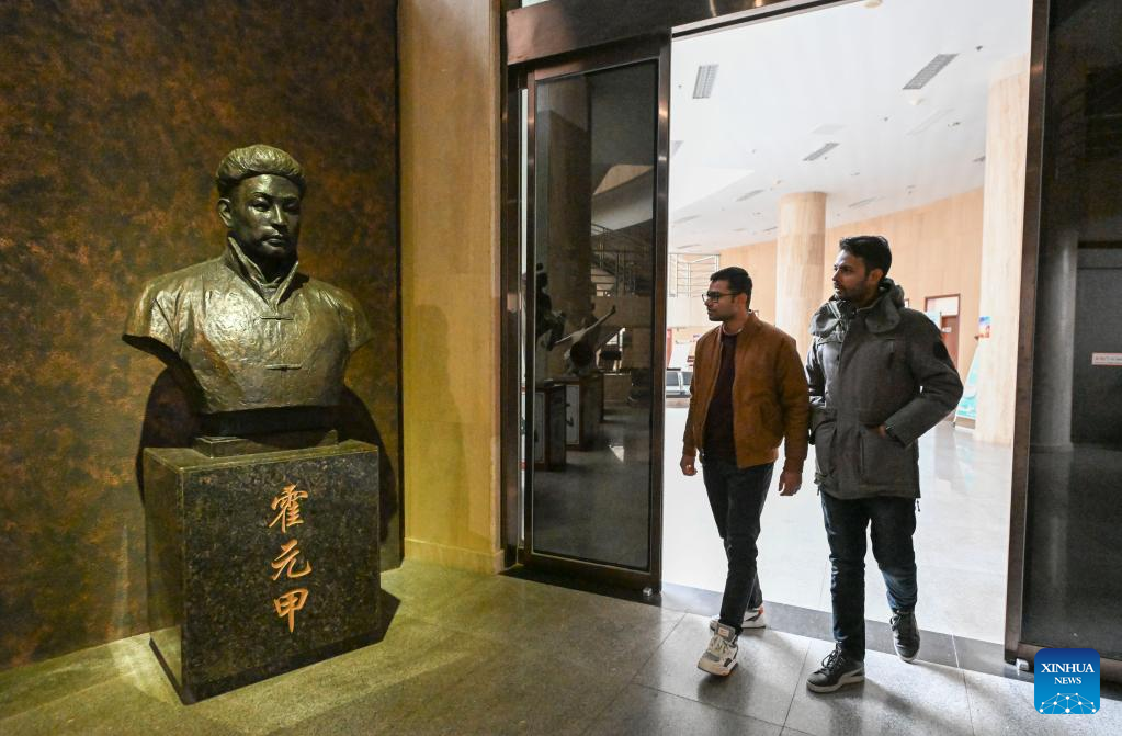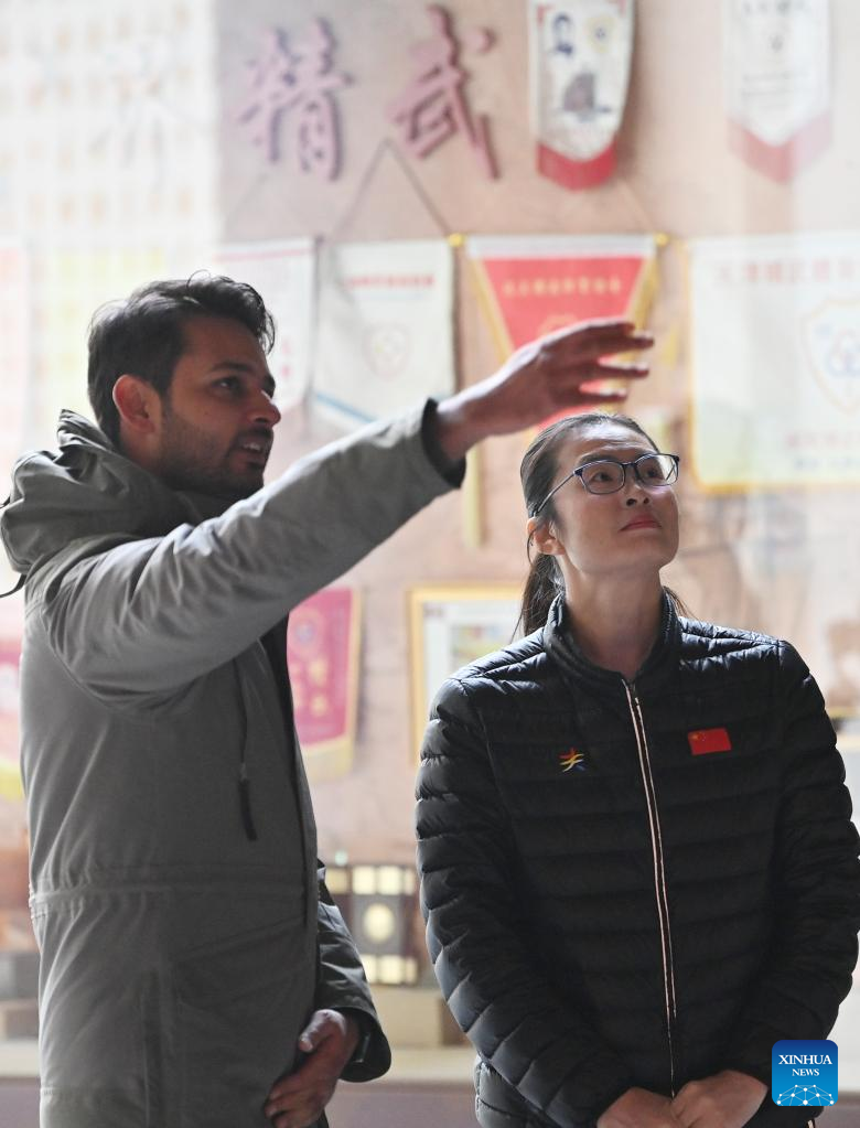 Muhammad Nabil (R) visits a memorial hall commemorating Kung Fu legend Huo Yuanjia with his friend in Jingwu Town of Xiqing District in north China's Tianjin, Dec. 25, 2022.
