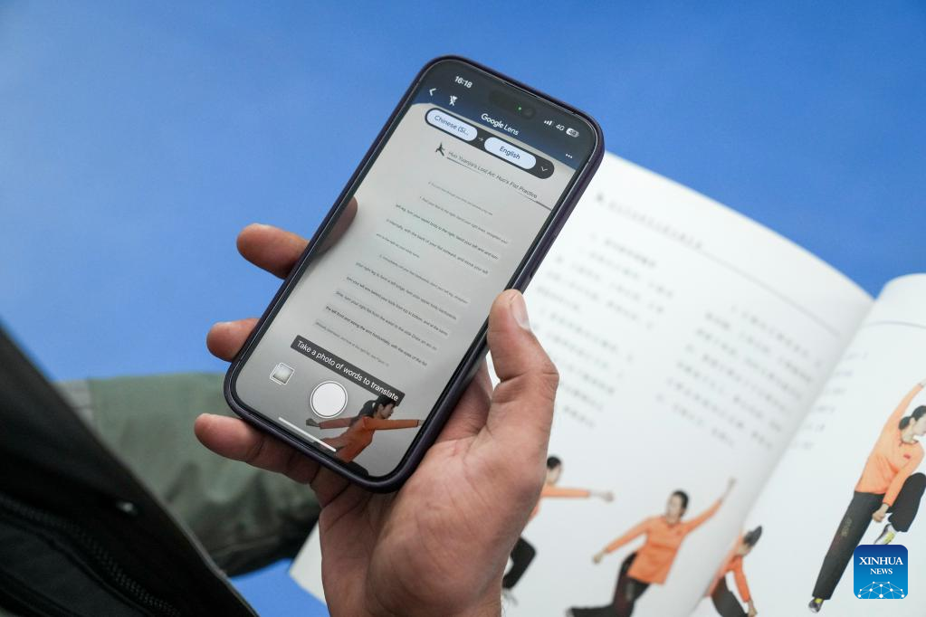 Muhammad Nabil reads a Chinese book about Huo-style boxing with translation software at a martial arts gym in Xiqing District, north China's Tianjin, Dec. 25, 2022.