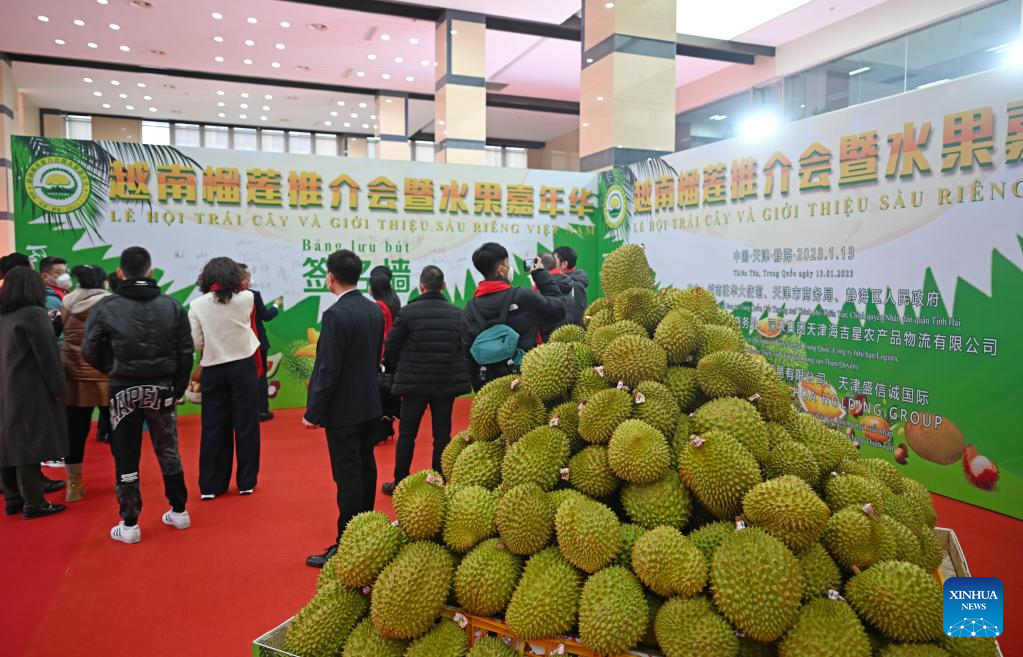 People attend an promotion event for fruits from Vietnam in North China's Tianjin, Jan. 13, 2023. People's social and economic activities gradually return to normal after China's optimization of its COVID-19 response measures. (Xinhua/Zhao Zishuo)