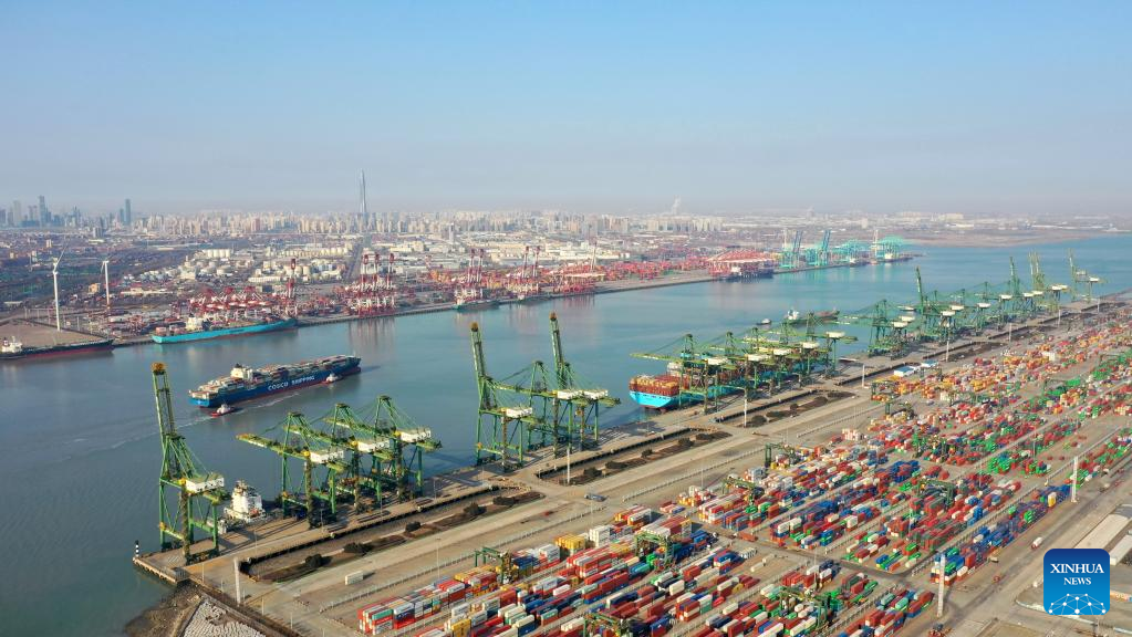 This aerial photo taken on Jan. 10, 2023 shows a container terminal at the Tianjin Port in north China's Tianjin. People's social and economic activities gradually return to normal after China's optimization of its COVID-19 response measures. (Xinhua/Zhao Zishuo)