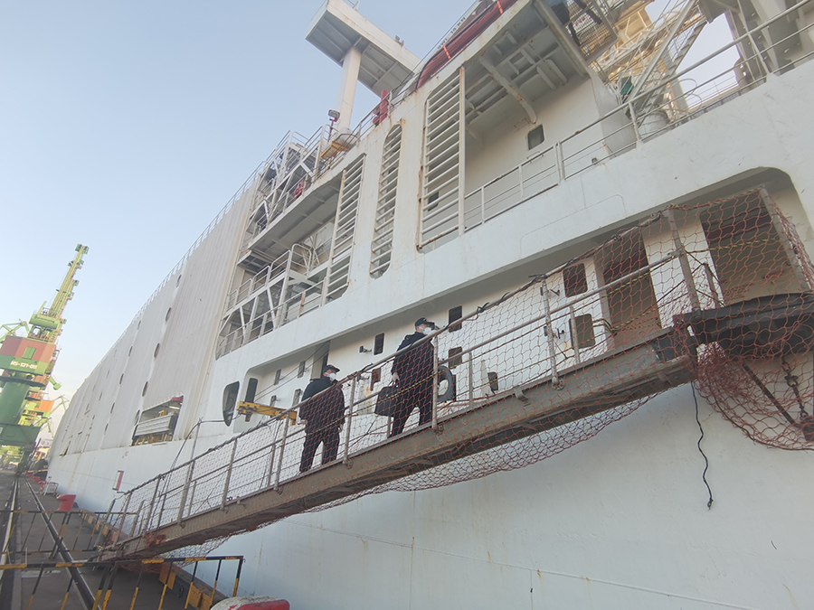 Tianjin Customs officers board a ship to examine imported products on Tuesday. [Photo provided to chinadaily.com.cn]