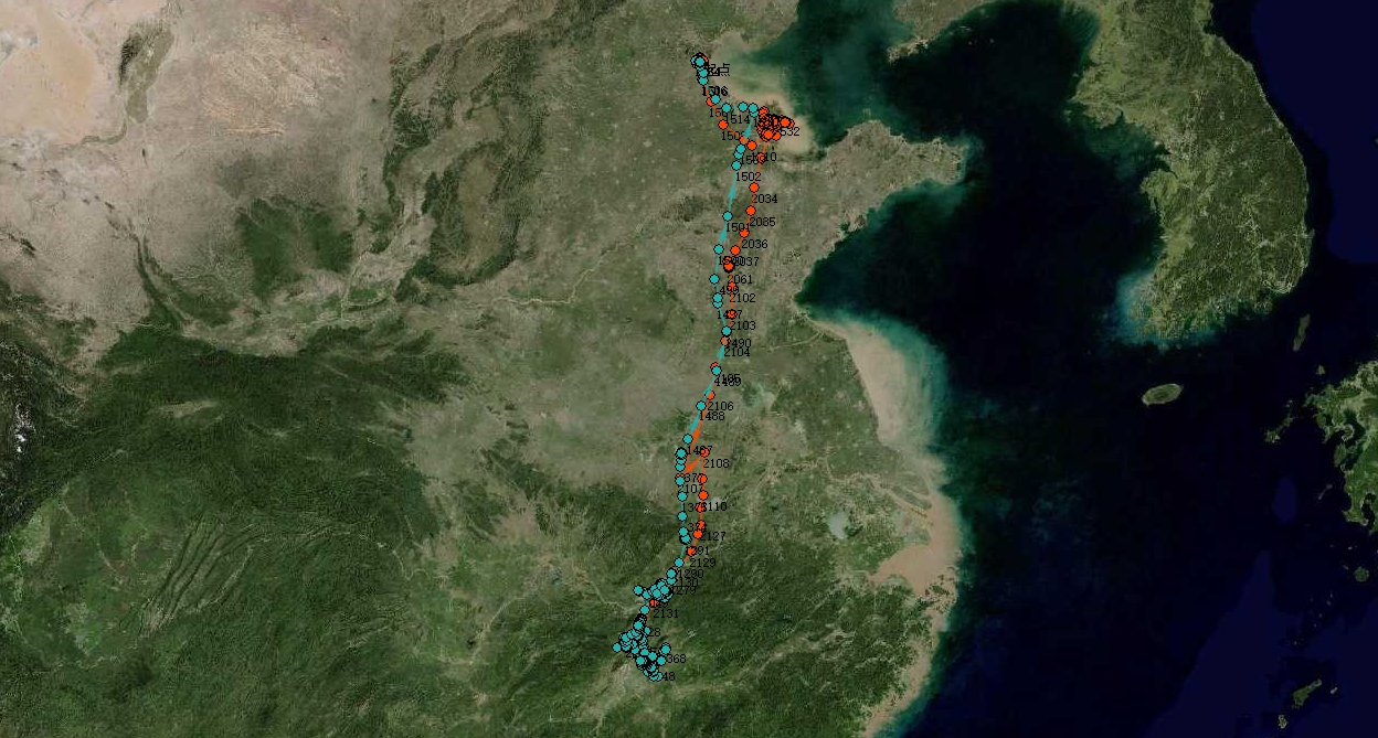 卫星追踪技术捕捉“天天”活动轨迹图红线为南迁路线蓝线为越冬点位及北迁路线