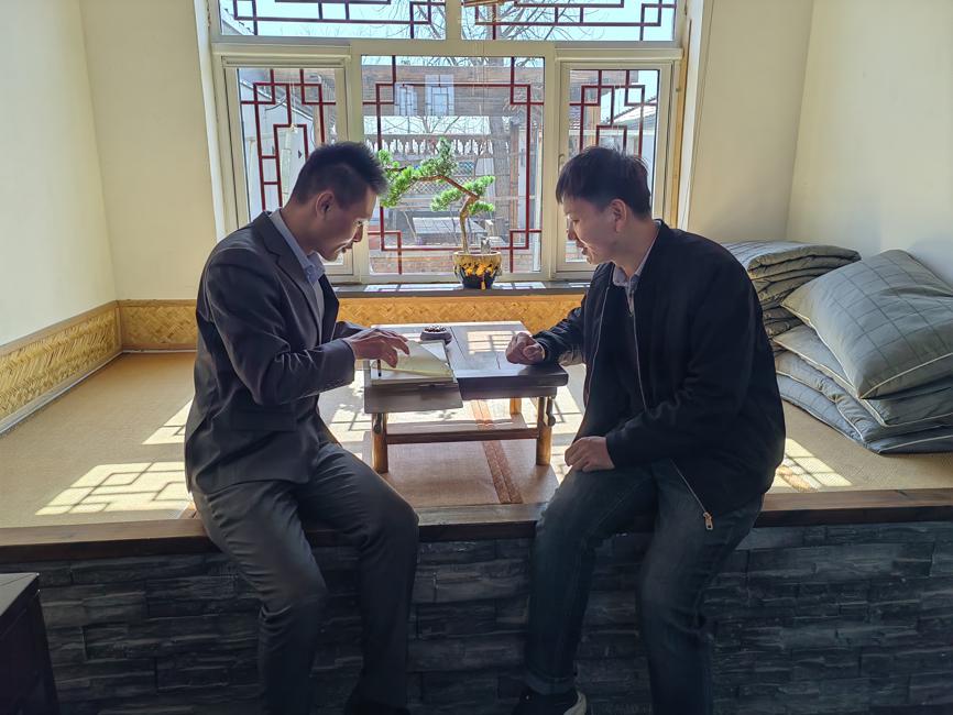 Wang Yuhao (left), a newly selected"village CEO", talks about a plan with a local official at a homestay in Mutouwo village in Tianjin's Ninghe district. [Photo provided to chinadaily.com.cn]
