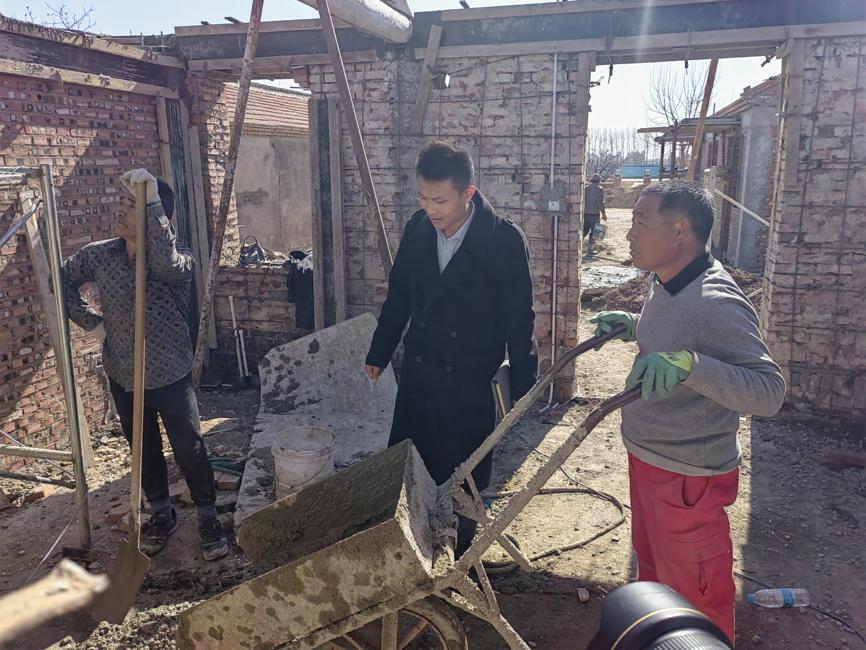 Wang Yuhao (center), a newly selected"village CEO", visits the construction site of a new homestay in Mutouwo village in Tianjin's Ninghe district. [Photo provided to chinadaily.com.cn]