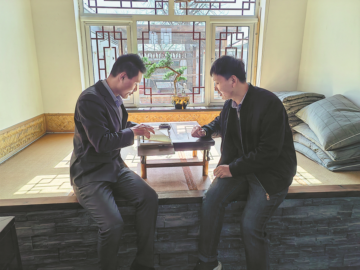 Wang Yuhao (left) discusses development plans with a village official at a homestay in Mutouwo village, Ninghe district, Tianjin. CHINA DAILY