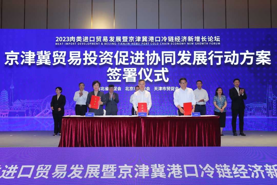 6月30日,记者从北京市贸促会获悉:“京津冀国际投资贸易洽谈会”系列活动——“2023肉类进口贸易发展暨京津冀港口冷链经济新增长论坛”当天在天津滨海新区举办,京津冀三地贸促会共同研究签署了《京津冀贸易投资促进协同发展行动方案》。