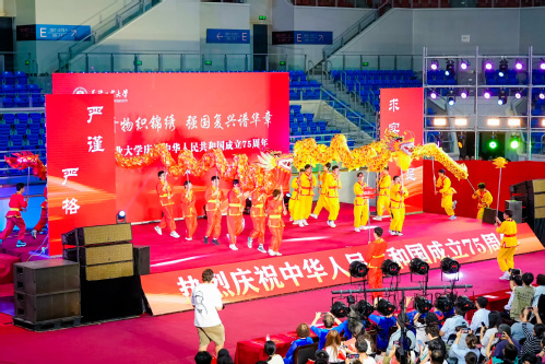 “我们祝福你的生日,我的中国,这是儿女们心中期望的歌,今天是你的生日,我的中国……”9月29日下午,当两条“飞龙”上下舞动奔向舞台时,瞬间引爆了文艺演出现场。伴随着师生们的深情演唱,天津工业大学庆祝中华人民共和国成立75周年文艺演出正式拉开帷幕。在这里,灯光熠熠的舞台成为思政课的讲台,一个个激昂慷慨的唱词、一段段娓娓动情地讲述、一幕幕感人至深的舞蹈,寓情于景、寓景于情,成为了天津工业大学大思政课的“活教材”,持续“燃炸”全场。