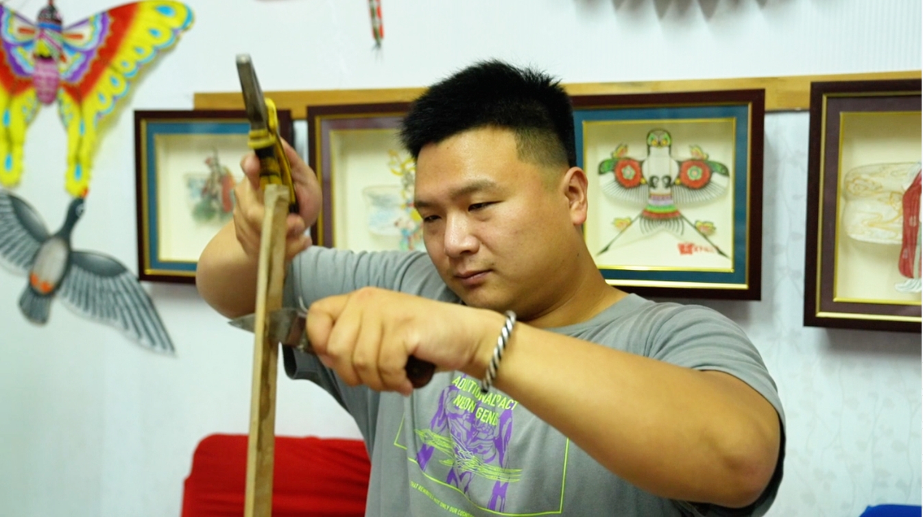 “2016年,我大学毕业后选择回到家乡学习家族的风筝制作技艺。其实在我小时候,父亲制作风筝时,我就经常会打下手,比如:包装纸盒、贴商标、给大鱼风筝贴眼睛等等,那时候,一家人共同忙碌的场景让我感到非常开心。”童年的经历让魏博文对制作风筝产生了深厚的情感。在学习制作过程中,父亲对他的训练非常严格。“基本功是练习勾线和勾报纸,我画了6个月的报纸。报纸底下有字迹,画线最初是粗的,后面需要像丝带那么细。”魏博文还学习劈竹子来锻炼手感,“顾客买风筝时都需要检查是否有刺儿,有一点儿刺儿都不行。想要出售,就得把风筝骨架做得很细致。制作风筝要考虑骨架、造型和做工。一般的风筝非常重,我们家的风筝很轻,掂起来四角都是颤动的。实际上,这项技艺并不难掌握,有父亲教授我这些东西,我只需要自己多练习,一遍不行就继续练,练到行为止。”