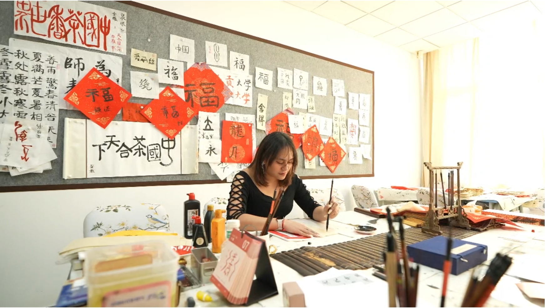 安雅介绍,她的8个兄弟姐妹中有4个都曾在中国留学,“我的哥哥姐姐经常和我提起中国,对中国的向往从小就在我心里扎下了根。”2019年,她成功申请中国政府奖学金,在对外经济贸易大学学习一年中文后,进入天津工业大学经济与管理学院学习,如今她正在攻读学校国际教育学院的研究生。“我对中国文化非常感兴趣,尤其是书法。我们上课的时候就有机会接触到书法,老师会教我们怎么拿笔,怎么写。开始我觉得自己的字不好看,我就挑战自己一直练。老师看我对书法特别感兴趣,还送给我毛笔、墨汁,假期的时候我经常在宿舍临摹练习。”